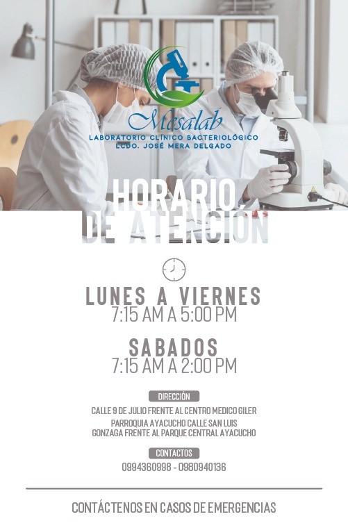 Ofrecemos Servicio de Toma de Muestra a Domicilio en horarios de Lunes a Sabado, Para agendar su cita puede contactarse al 0980940136-0994360998-0992414933